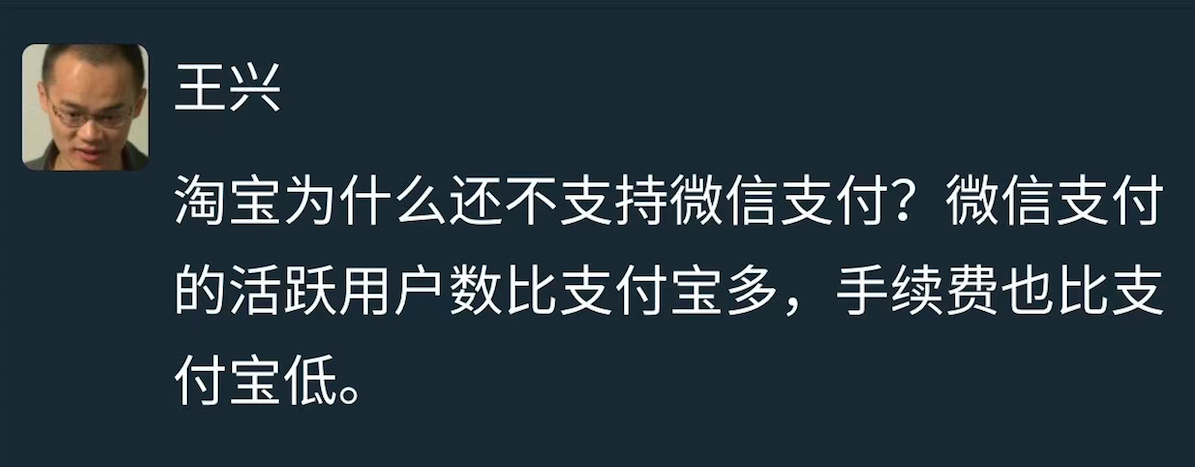 “淘宝为什么还不支持微信支付?微信支付的活跃用户数比支付宝多,手续费也比支付宝低。”