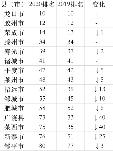 界面山东梳理发现,与去年赛迪顾问县域经济研究中心编制的“县域经济100强(2019年)榜单” 相比,山东进入百强的县(市)总数有所减少,青州市、乳山市、高密市在今年遗憾退出百强榜单(蓬莱市因今年区划调整改立蓬莱区,因此不在2020年百强县榜单中)。