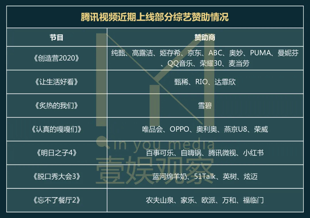 壹娱观察(ID:yiyuguancha)根据信息整理了腾讯视频近期上线的部分综艺赞助情况,发现综N代、选秀节目仍是容易获得广告商注意的类型。当然,这其中也有体量、定位、新老节目等因素的影响。