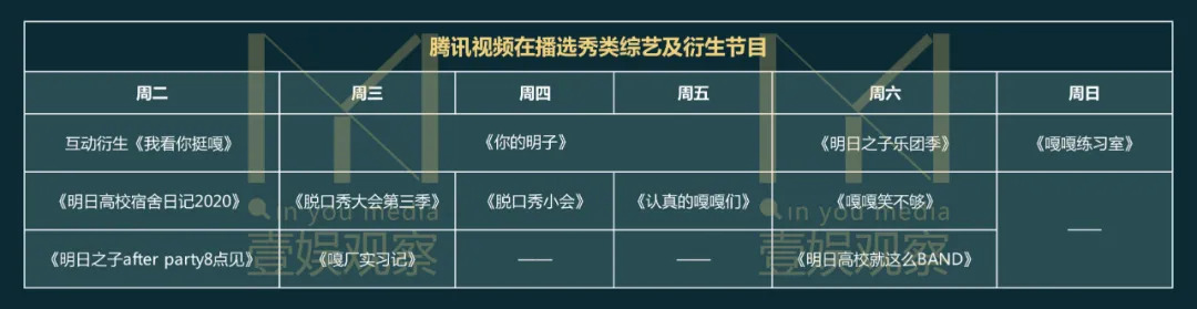 换句话说,《明日之子》接档“创”系列是腾讯视频延用了两年的排播方式,去年又加上了回归的《脱口秀大会》。