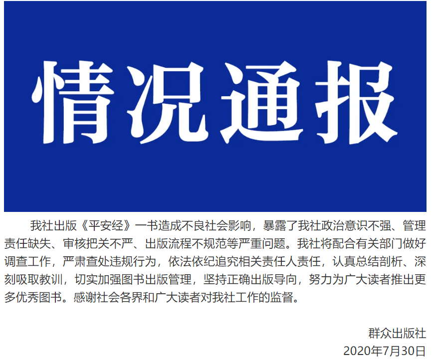 2020年7月30日,群众出版社发布情况通报称,该社出版《平安经》一书造成不良社会影响,将配合有关部门做好调查工作,严肃查处违规行为,依法依纪追究相关责任人责任。