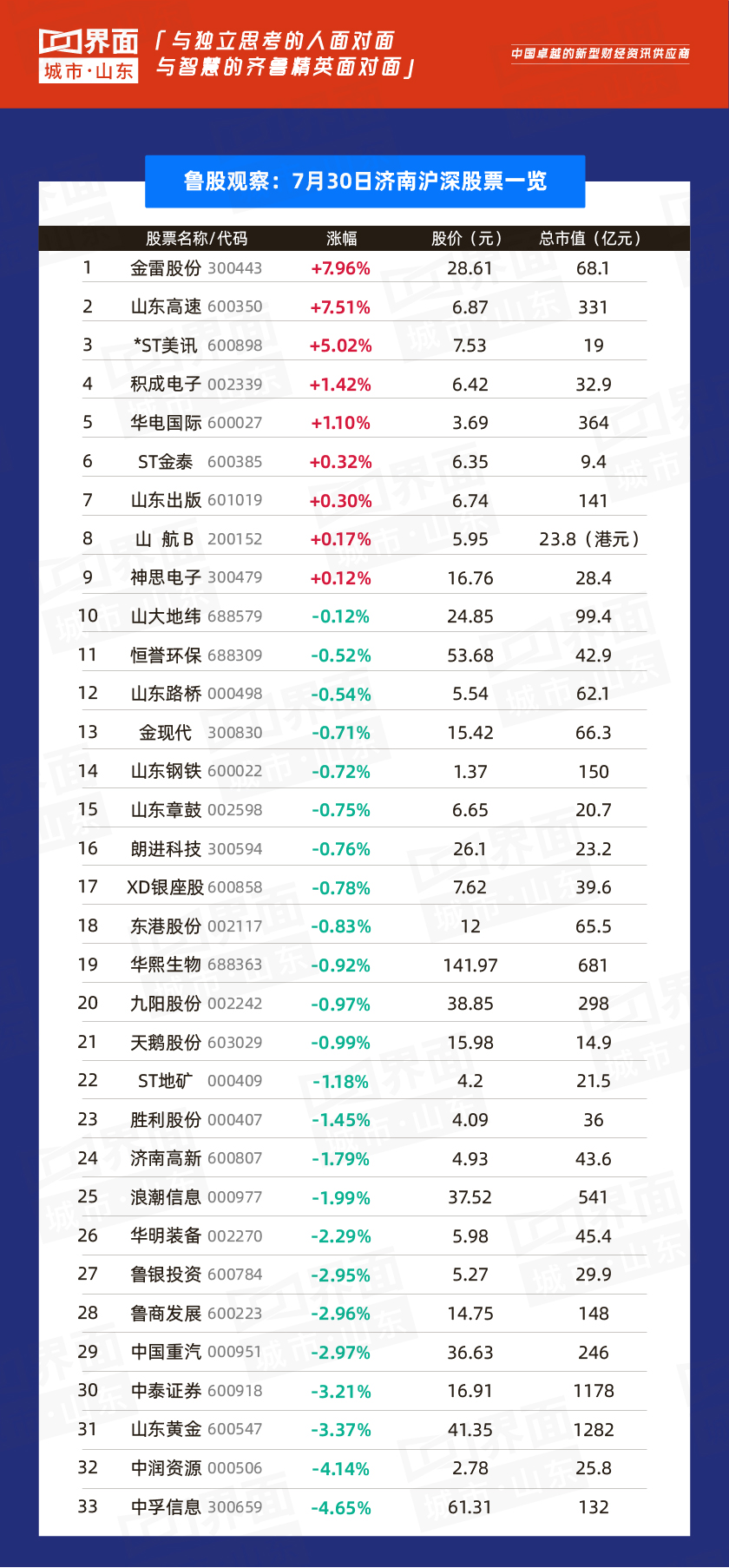 7月30日,山东省内沪深股票有91只个股上涨,120只下跌,6只与上一个交易日收盘价持平;