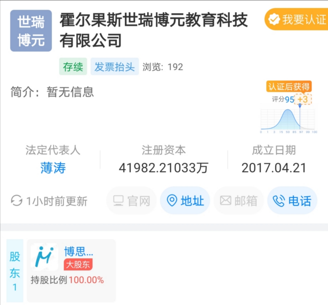 股权转让完成后,霍尔果斯万达教育现已更名,现名为霍尔果斯世瑞博元教育科技有限公司。法人代表由万达地产集团总裁张霖变更为薄涛。除控股博思美邦外,薄涛名下另有多家教育类公司。