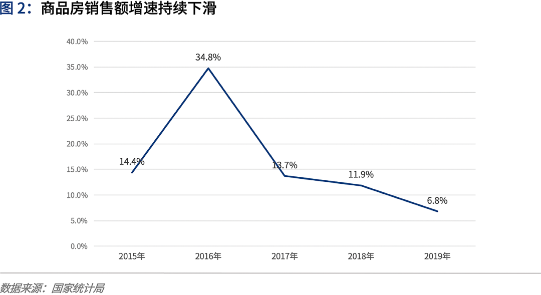 一方面,由于以“房住不炒”为基调的房地产调控政策的作用和市场需求总量的下滑,房地产开发业务的增速和利润率都处于下行周期。2019年,全国商品房销售额约16万亿元,增速从2018年的11.9%下滑到6.8%。受到COVID-19疫情对上半年销售的影响,2020年的市场增速预期也并不乐观,预计销售额增速将进一步下滑。