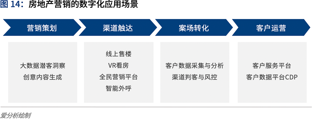 在房地产营销场景,移动互联网、大数据、AR/VR、人工智能技术在营销策划、渠道触达、案场转化和客户运营等环节都有相关落地场景。