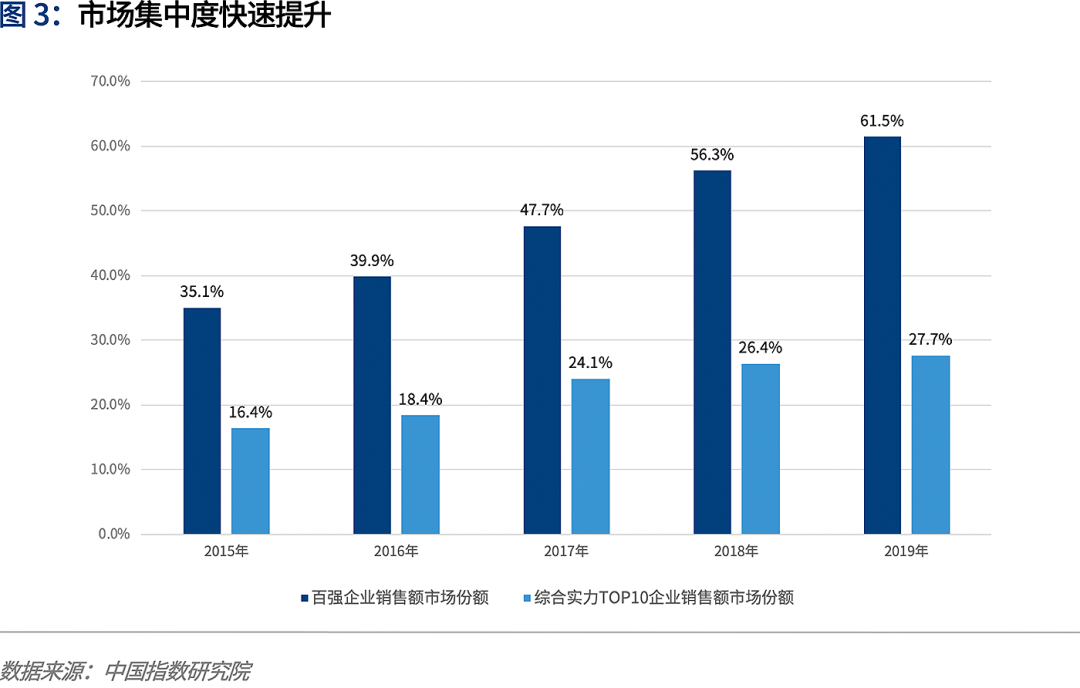 另一方面,在市场下行周期,头部房企在融资能力、土地储备、经营能力等方面的优势更加凸显,叠加COVID-19疫情对现金流的冲击,大量中小房企被并购或破产退出市场,行业整合进程加速,行业集中度不断提升。2019年,百强企业的销售额市场份额继续提升到61.5%。