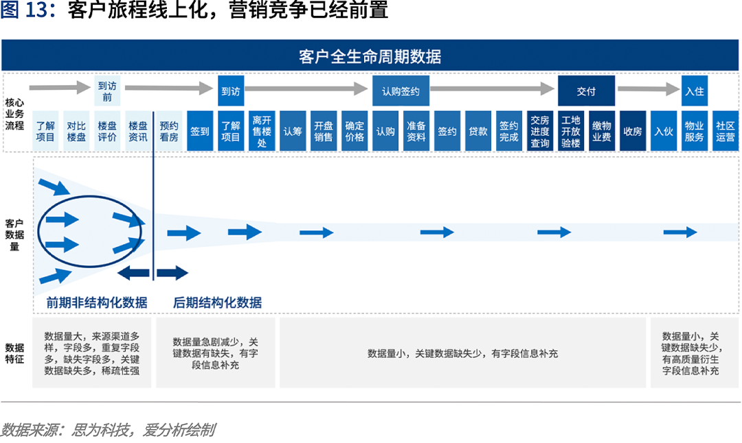 其次,客户的购房旅程已经高度线上化。随着客户购房的投资属性弱化、消费属性增强,以及线上资讯获取习惯的养成,客户在购房旅程中的决策周期更加漫长,并且相关信息获取途径和行为轨迹更多地出现在线上渠道。尤其在到访案场前的阶段,客户会在线上留存大量有价值的行为数据。因此,开发商的营销必须具备在线上触达、洞察、影响和服务客户的能力。