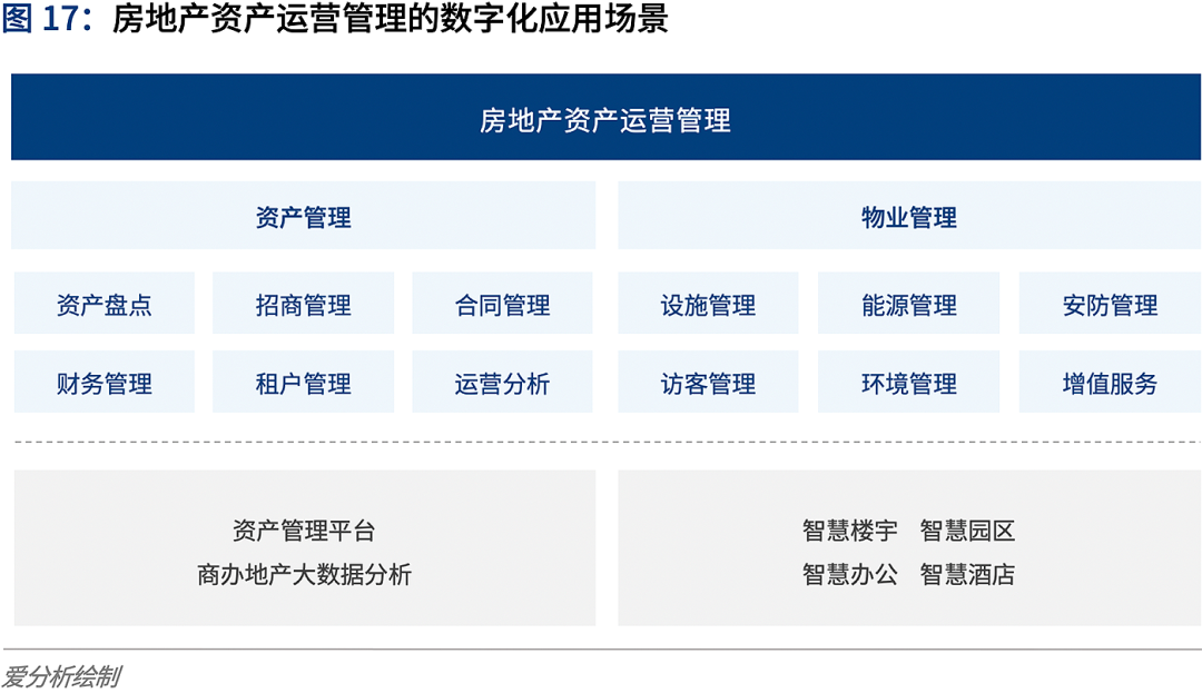 房地产资产的运营管理包括资产管理和物业管理两大场景。资产管理是从财务视角关注资产的现金流状况,管理物业的招商、租赁合同、收入和资产价值。物业管理是从日常运营和服务的视角,对物业的设施运行状况、能源消耗、访客流动、环境等进行管理,并向用户提供保洁、安保等物业服务,保证物业处于良好和高效的运营状态。