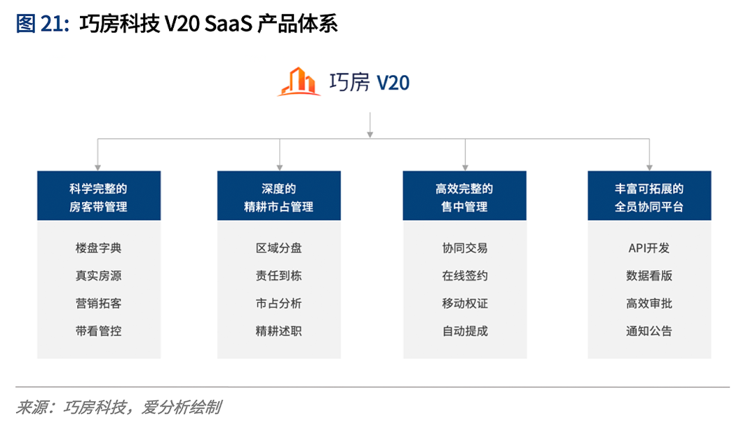 巧房科技的核心产品是一套V20 SaaS系统,并基于V20SaaS所覆盖的房地产交易全流程场景,提供金融、新房分销等增值服务。V20 SaaS系统为电脑客户端、移动APP双端协同,分为业务系统、营销管理系统、中后台支持系统三个主模块。业务系统覆盖二手房和新房等在内的租赁、买卖和资理业务,并涵盖相关的房源管理、客户管理、房客匹配撮合、交易流程管理和考核体系等;营销管理系统包括线上获客渠道对接和效果评估、微门店和微官网等营销工具,帮助经纪公司提升获客效率,打造展业工具;中后台支持系统包括人力资源、财务薪资、成本核算、数据分析等模块,提供综合的中后台支持。