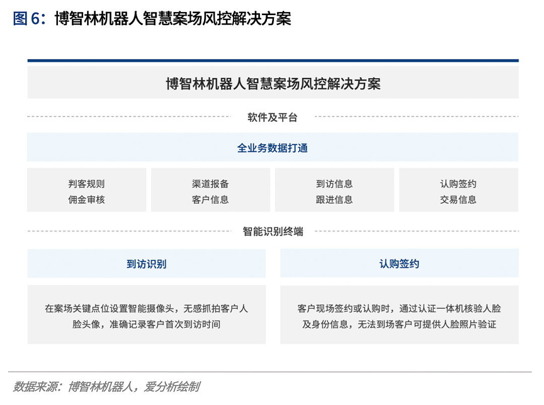 博智林机器人隶属碧桂园旗下,是一家以建筑机器人等房地产行业相关智能设备及系统研发为核心的技术服务商。博智林基于自身人工智能博士团队及自研人脸识别算法,为房企打造了一款“智慧案场风控系统”,旨在通过技术的力量帮助房企提升案场营销的风控效果。