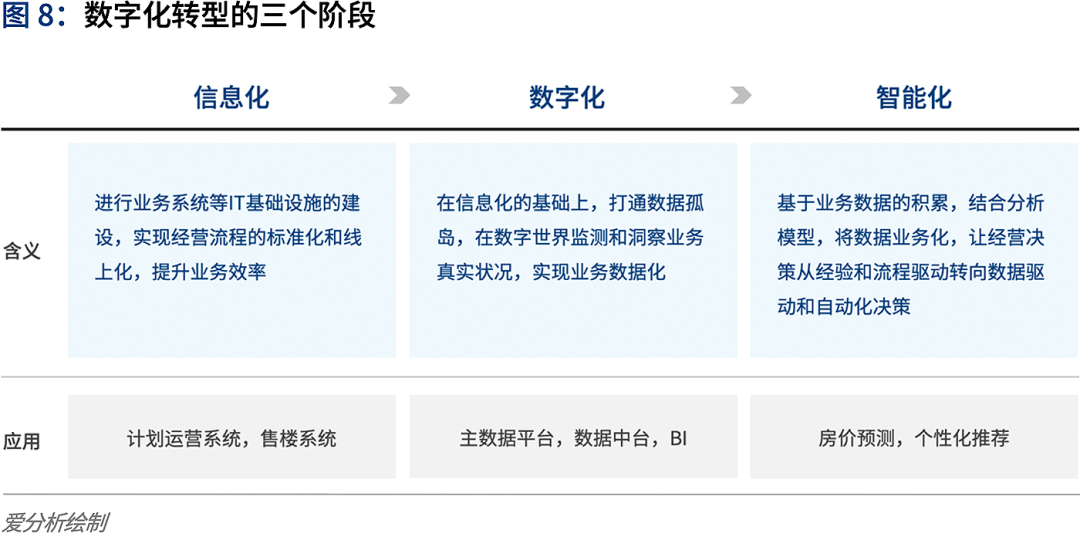 实现上述价值创造的房地产数字化转型,是一个循序渐进的过程,可以划分为信息化、数字化、智能化三个主要阶段。
