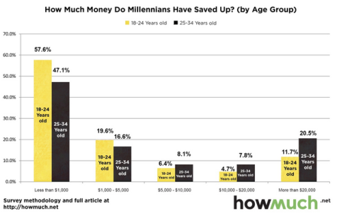 个人理财网站howmuch.net最近一项调查显示,美国千禧一代中超过一半人的存款低于1,000美元。这项调查由谷歌消费者调查(Google Consumer Surveys)发起,针对2,550名研究对象进行调查,研究对象的年龄分布为18-24岁和24-35岁两个年龄层。