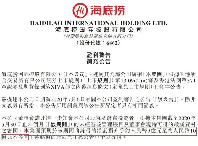 7月6日,海底捞发布盈警公告。公告显示,公司预计2020年上半年收入较2019年同期下降月20%,所录得的净亏损介于人民币9亿元至10亿元不等。而在2019年上半年,海底捞的归母净利润为9.11亿元,预计海底捞上半年净利润同比下滑约200%。