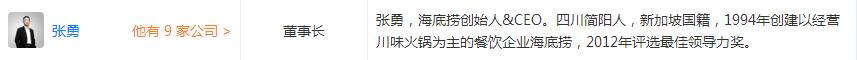 据天眼查显示,张勇系海底捞创始人&CEO。四川简阳人,新加坡国籍,1994年创建以经营川味火锅为主的餐饮企业海底捞。
