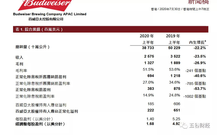 7月30日早间,百威亚太公开了截至2020年6月30日止六个月的未经审核中期业绩及2020年第二季财务资料,收入、利润都是双位数下滑,让投资者大跌眼镜。