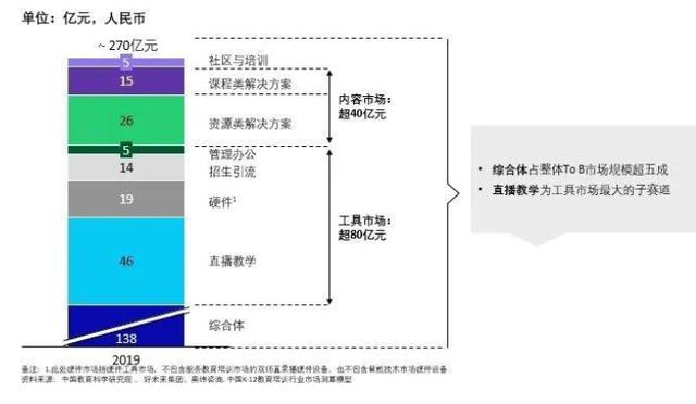 就教育To B市场而言,疫情助推培训业态升级,培训机构纷纷探索新模式,让B端市场需求迅速扩大。据《2020中国K12教育培训TOB市场发展报告》,2019年,教育To B市场规模接近270亿元,预计到2025年,整体市场规模将突破千亿元,而直播教学将会是工具市场最大的子赛道。