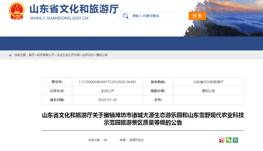 日前,山东省文化和旅游厅发布公告,显示撤销潍坊市诸城大源生态游乐园和山东雪野现代农业科技示范园旅游景区质量等级。