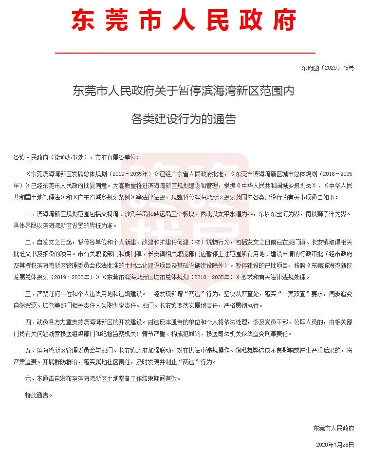 7.29日东莞市政府发布《东莞市人民政府关于暂停滨海湾新区范围内各类建设行为的通告》,严禁任何违建,暂停滨海湾新区规划范围内所有用地、建设申请的行政审批,包括发文之日前已取得相关批准文书及报备的项目。