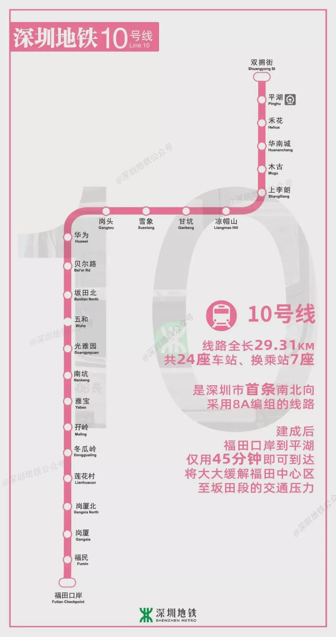 深圳地铁10号线是深圳轨道交通三期二阶段线路之一,起于福田口岸站,途经福田区、龙华区、龙岗区,止于双拥街站,线路全长29.31公里。共设24座车站,全部为地下车站。