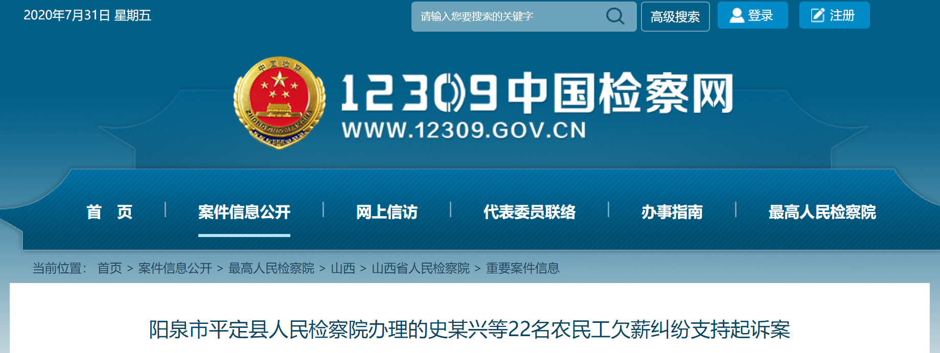 7月31日,中国检察网发布《阳泉市平定县人民检察院办理的史某兴等22名农民工欠薪纠纷支持起诉案》。