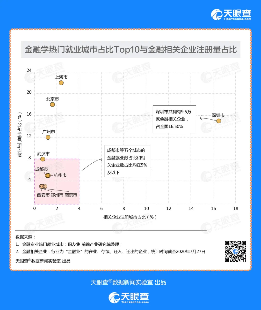 吸引我国大多数金融学类专业毕业生的十大城市,到底有多广的金融行业产业链?天眼查数据新闻实验室选取了这十座城市金融行业企业的数量,发现深圳的企业数远超其他城市,达到9.5万家,占全国16.5%。上海、北京、广州三个城市的金融行业企业数均占全国4%以下。