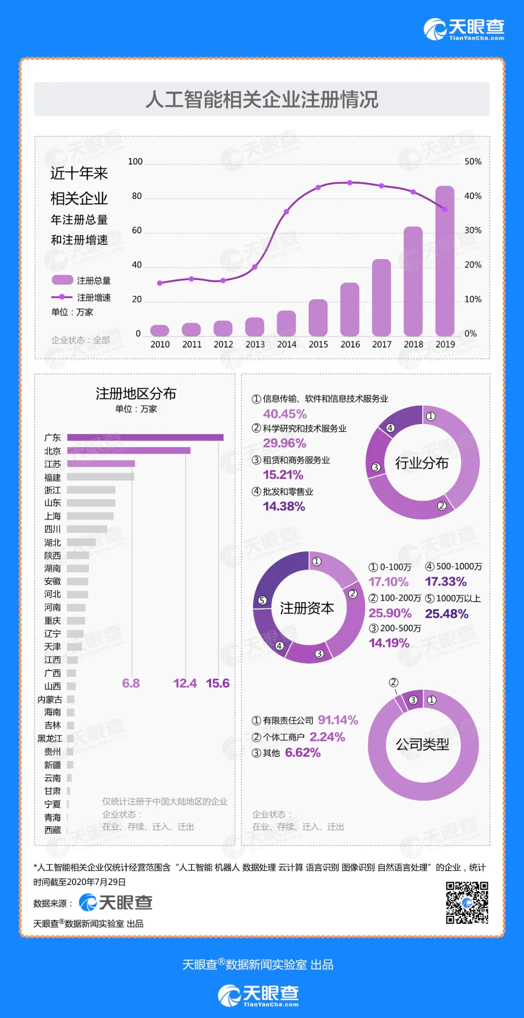 而对应到相关行业,表现如何呢?天眼查专业版数据显示,我国经营范围含“人工智能、机器人、数据处理、云计算、语言识别、图像识别、自然语言处理”,且状态为在业、存续、迁入、迁出的企业(以下简称“人工智能相关企业”)超80万家。