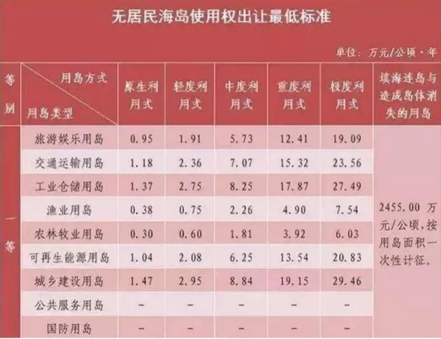 参考自然条件等因素,辽宁省将这些岛屿划分成6个等级。按照不同的用岛方式、用岛类型,使用金也大不同。最贵的每年要支付2455万元/公顷,最便宜的才1200元/公顷。