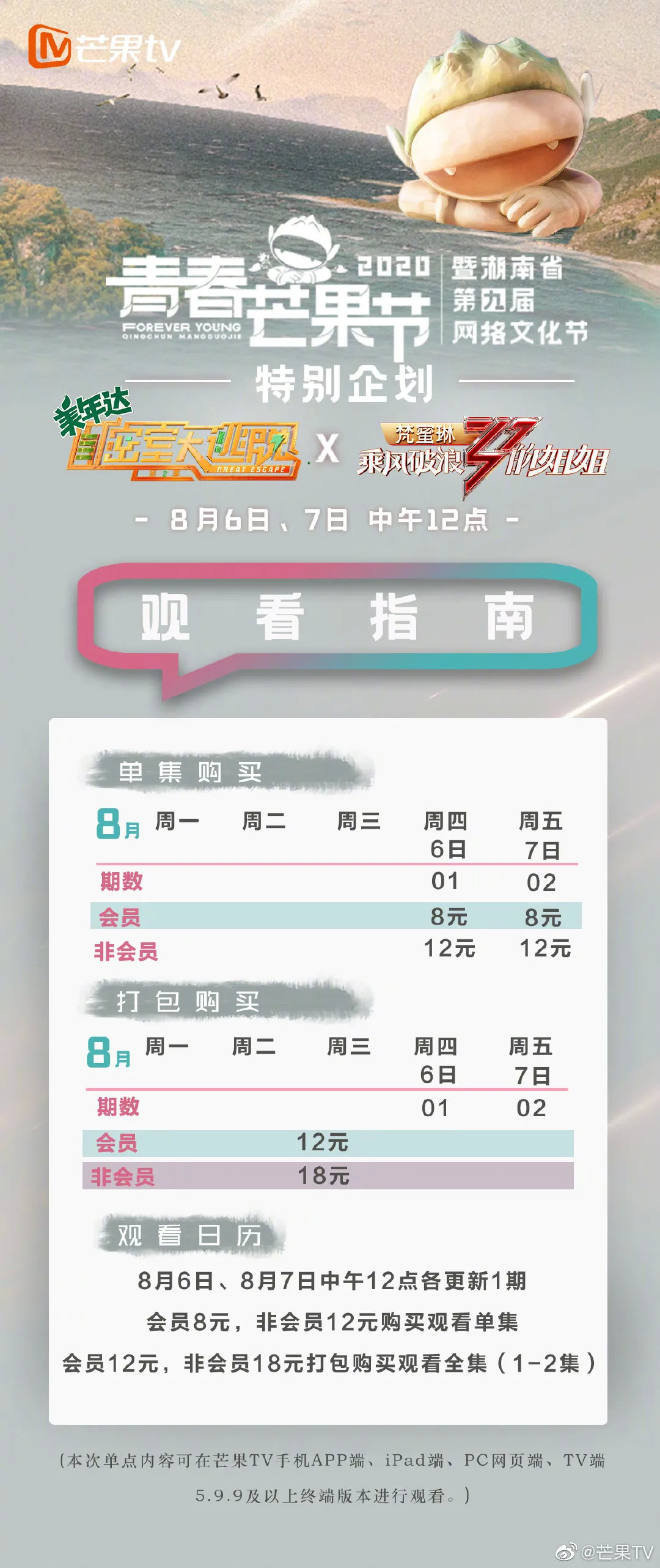 这次联动的特别节目将会分为两期,在8月6日和7日两天中午12点上线芒果TV,平台将以会员单期8元、两期打包价12元,非会员单期12元、两期打包价18元的价格,对观众销售这两期节目,而普通用户应该会在一周后转免,这也意味着这次综艺超前点播有效期为一周时间。
