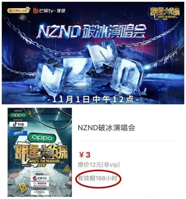 在去年11月份时,《明星大侦探5》即将上线前的一周,芒果TV以单期节目会员3元、非会员10元的价格,向观众单集售卖明侦系列的头部IP“NZND破冰演唱会”,有效期同样为一周时间。