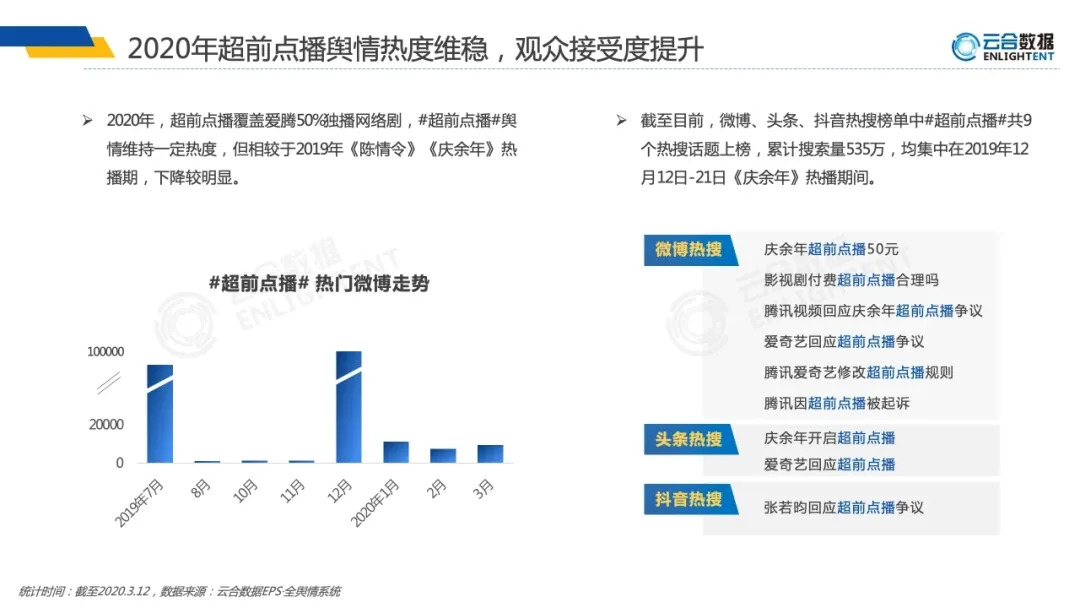 据云合数据统计显示,2020年,超前点播已经覆盖了50%的独播网络剧,观众对于#超前点播#舆论维持在一定热度,相较于此前引发的排斥心态,近段时间观众的接受度具有明显提升。
