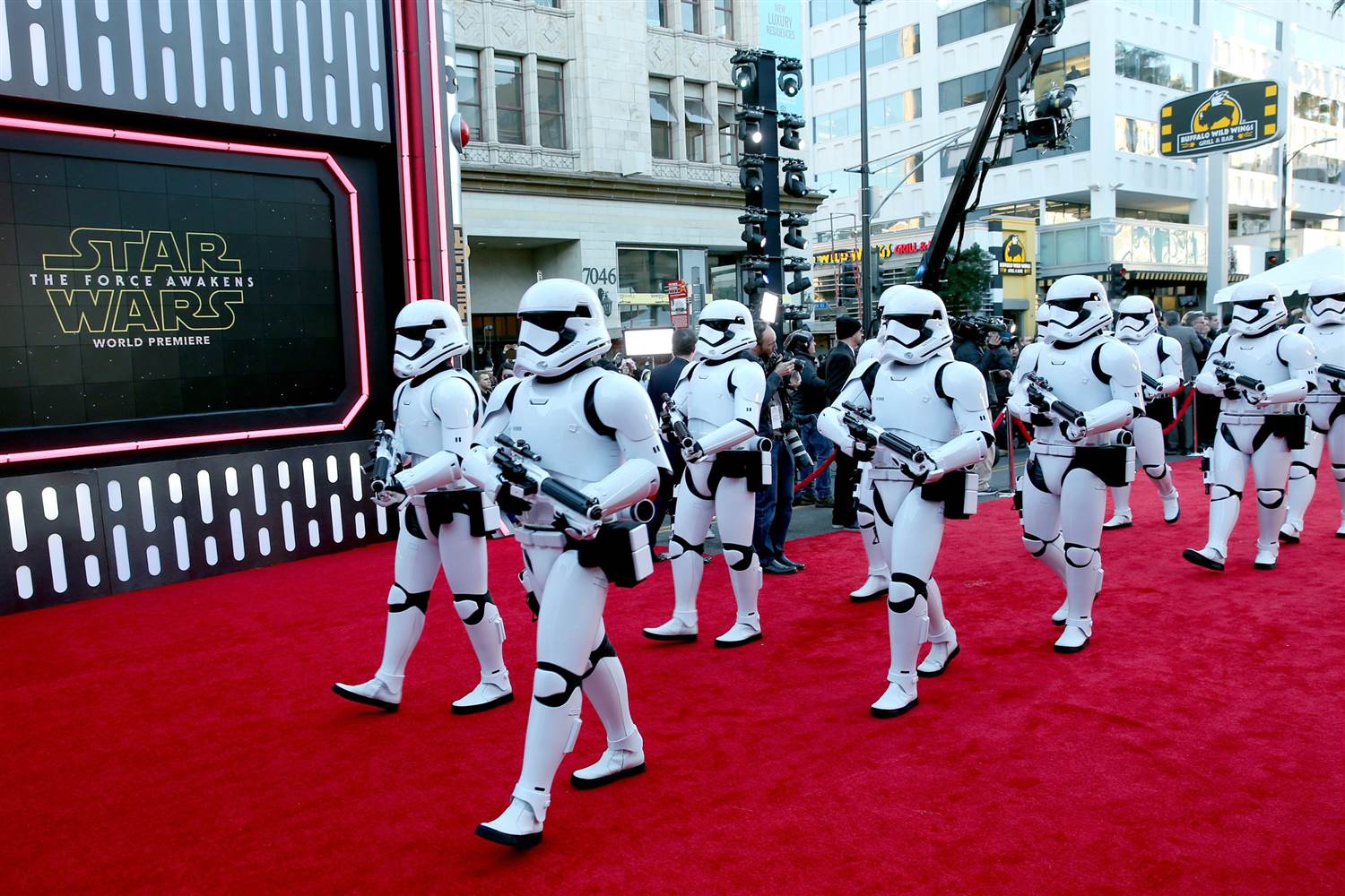 Hollywoodreporter网报道说,本次《星球大战:原力觉醒》的首映礼规模远超奥斯卡颁奖礼,由于这次首映仪式明星云集,主办方特意准备了一条1,500英尺(约450多米)长的红地毯,是奥斯卡红毯长度的2.5倍。除了令人目不暇接的明星,现场还有许多《星球大战》系列经典形象的Cosplay,比如成群结队的“帝国突击队”士兵和乐高版凯洛·伦。