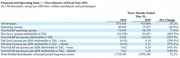 7月30日,好未来(TAL.NYSE)公布截至2020年5月31日的2021财年第一财季未经审计财务报告。财报显示,好未来实现净收入为9.107亿美元,同比增长35.2%;实现净利润为8165.1万美元,2019年同期净亏损为1615.6万美元;经营利润为3549.1万美元,同比下降26.8%。
