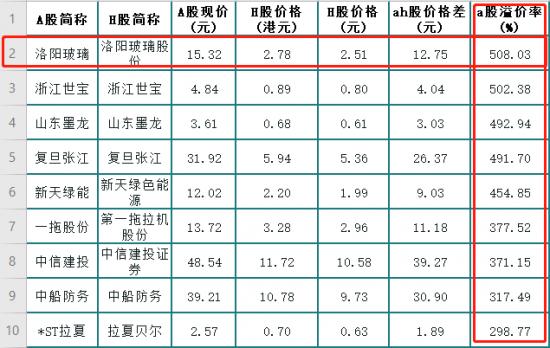 举个例子,在全部的128只A/H股票中,溢价率最高的是洛阳玻璃,港股价格为每股2.7港元,市值15.3亿港元。它在A股的价格则是15.3元人民币,市值达到84.6亿人民币,溢价率高达508%。