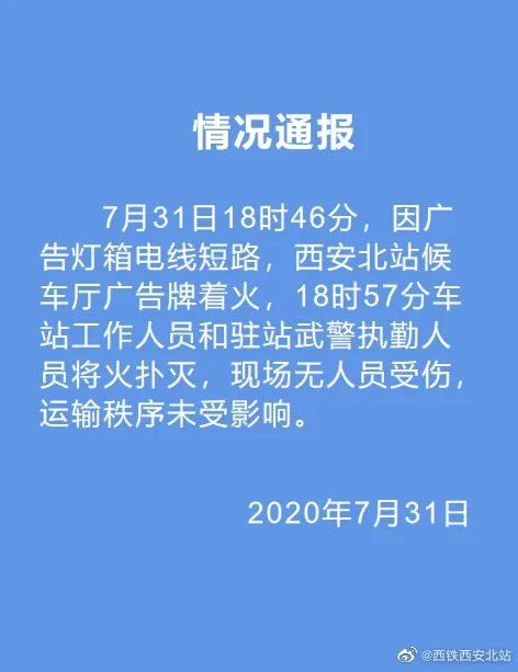 据西安铁路局西安北站消息,7月31日晚,因广告灯箱电线短路,西安北客站候车大厅内乘客头顶广告牌起火,随后,车站工作人员和驻站武警执勤人员立即出动将火扑灭。现场无人员伤亡,运输秩序未受影响。
