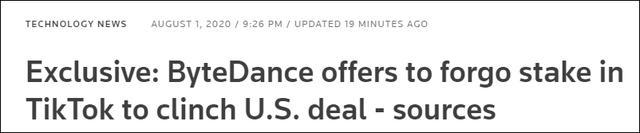 报道称,字节跳动此前希望保留TikTok在美业务的少数股权,但遭到白宫拒绝。一名消息人士称,白宫要求字节跳动必须全部退出TikTok在美业务,由微软集团接手。计划同时允许微软之外的另一家美国公司接手TikTok在美业务。而部分基于美国的字节跳动投资者,也可能被允许持有TikTok少数股权。