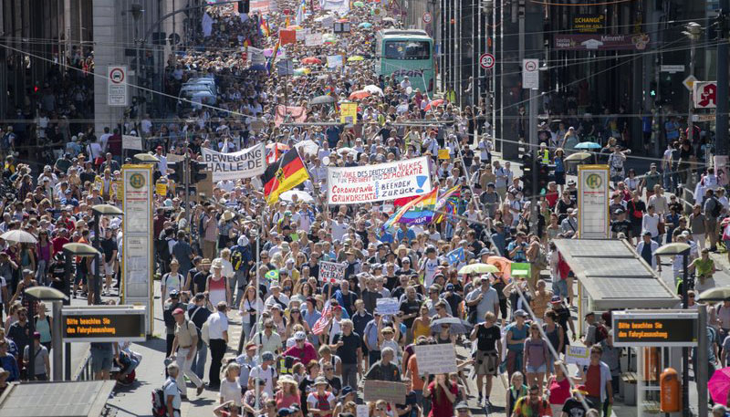 据美国有线电视新闻网(CNN)报道称,大多数示威者没有遵守社交距离规则,也没有配戴口罩。他们从勃兰登堡门走过柏林市中心,然后聚集在穿过柏林蒂尔加滕公园的一条宽阔大道上。