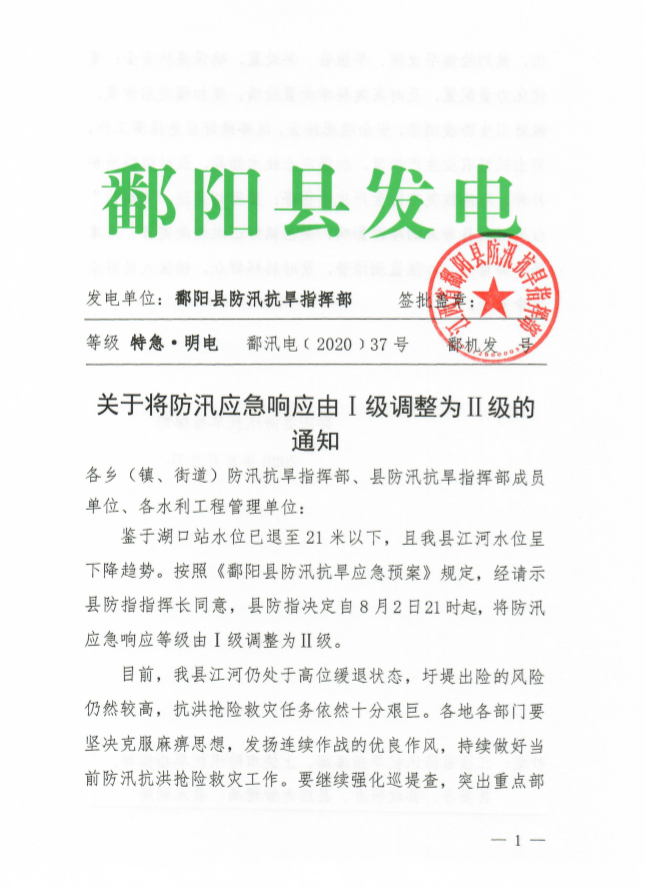 鉴于湖口站水位已退至21米以下,且鄱阳县江河水位呈下降趋势。按照《鄱阳县防汛抗旱应急预案》规定,经请示县防指指挥长同意,鄱阳县防指决定自8月2日21时起,将防汛应急响应等级由Ⅰ级调整为Ⅱ级。