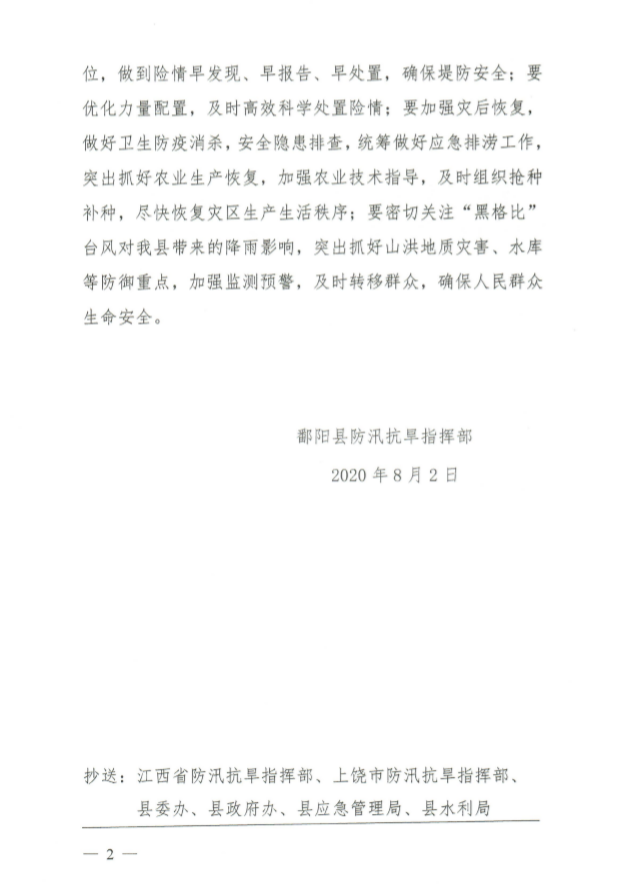 据鄱阳发布微信消息,8月2日,鄱阳县防汛抗旱指挥部发布《关于将防汛应急响应由Ⅰ级调整为Ⅱ级的通知》。