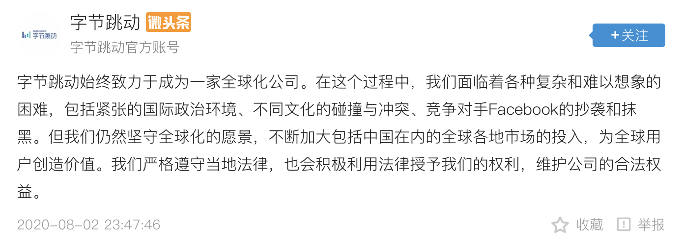 8月2日深夜,字节跳动在其今日头条官方账号上发布了一条声明,称面对紧张的国际政治环境和竞争对手Facebook的抄袭抹黑,将积极利用法律维护公司合法利益。