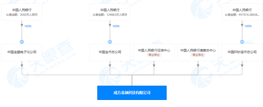 “成方金融科技”公司五位股东中,征信中心和清算总中心两家是央行直属的事业单位,中国金币总公司、中国金融电子化公司、中国印钞造币总公司这三家公司则是由央行100%控股。