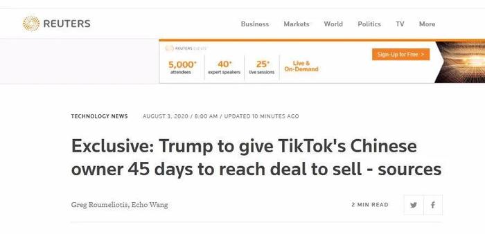 从早前透露的消息来看,微软500亿美金的收购是仅限于tiktok的美国业务,tiktok还可以掌控其他国家与地区的运营权。但从目前来看,似乎美国政商界均看出了Tiktok管理层的软弱与妥协,试图进一步将Tiktok的全球业务盘到手,彻底将Tiktok的全球布局掌握在自己手里。而据路透社消息,特朗普已经同意给中国字节跳动45天的时间来协商向微软出售TikTok的事宜。