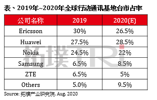 2019年中国和欧洲设备商占据全球5G基站85%的市占,瑞典爱立信(Ericsson)、中国华为(Huawei)、芬兰诺基亚(Nokia)为三大供应商。然而,华为受到中美贸易战与美方祭出的华为禁令影响,迫使其无法取得美国射频前端元件大厂供应的关键零部件,进而影响其基站外销受限,因此推估今年华为基站设备布建将以中国市场为主。