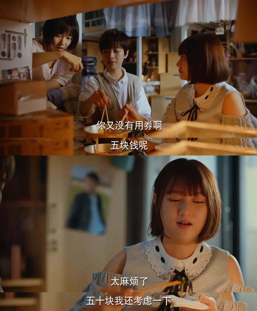囊中羞涩的她一边蹭饭,一边提醒家宝下次别忘了用上优惠券。