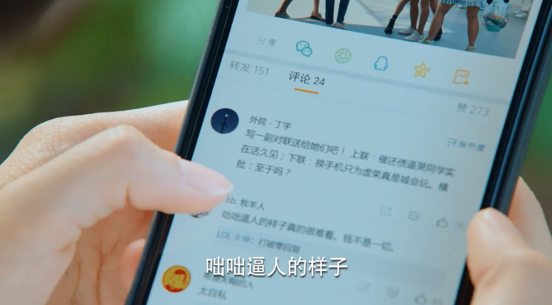 比如,剧里的围观群众就迅速把小果和王薇对峙的视频上传到微博。