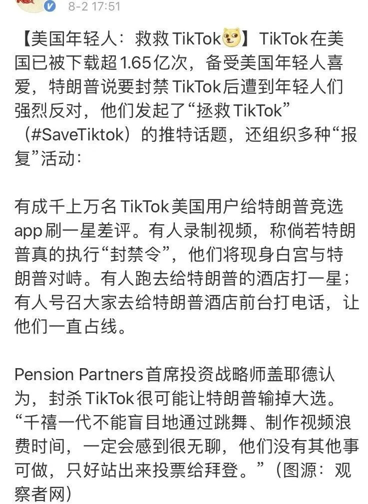 而在上周五,特朗普才宣称“关于TikTok,我们将禁止它在美国运营。”有意思的是,白宫方面似乎希望TikTok能被“美国人拥有”,美国财政部长姆努钦、国务卿蓬佩奥都相继支持微软收购TikTok。
