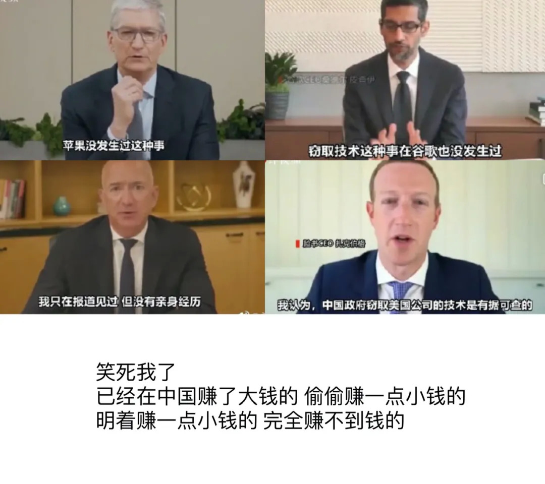 Facebook的扎克伯格、亚马逊的贝佐斯、谷歌的皮查伊以及苹果的库克,参加了这场长达6个半小时的反垄断听证会,而反垄断目标对准的正是中国企业。在听证会上,亚马逊、谷歌、苹果均表示,中国企业没有窃取美国互联网企业的技术,唯独扎克伯格斩钉截铁:“有!”