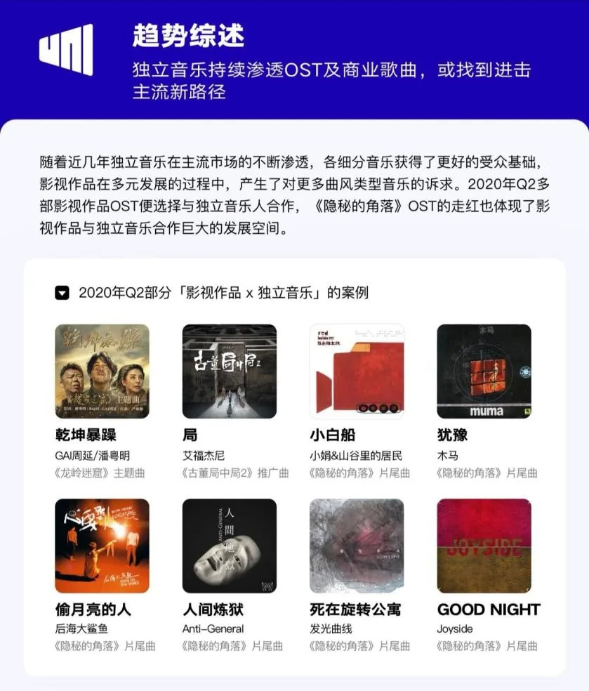 此外,《2020·Q2华语数字音乐行业报告》中还指出,影视作品×独立音乐目前正在成为更多片方的选择。艾福杰尼为《古董局中局2》演唱了推广曲《局》;GAI和潘粤明合唱了盗墓探险题材剧集《龙岭迷窟》的主题曲《乾坤暴躁》,也是十分成功的案例。