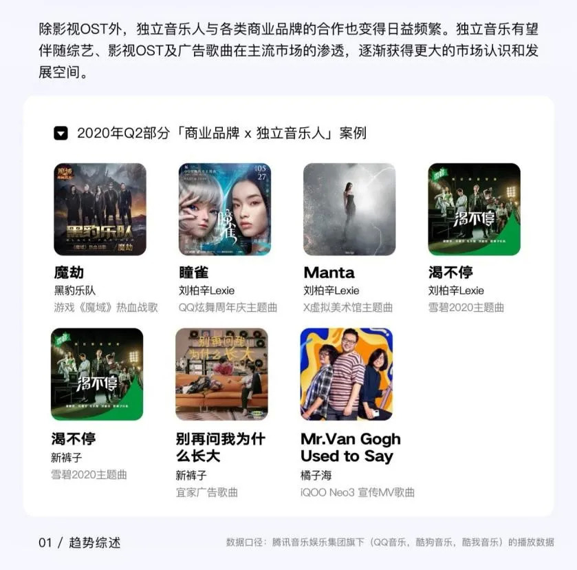 《报告》中就展示了这样一些案例,在《中国新说唱》上展露头角的刘柏辛Lexie合作了QQ炫舞周年庆主题曲《瞳雀》;雪碧品牌2020年最新主题曲《渴不停》邀请新裤子演唱;橘子海乐队新歌《Mr.Van Gogh Used to Say》则是IQOO Neo3宣传MV歌曲。
