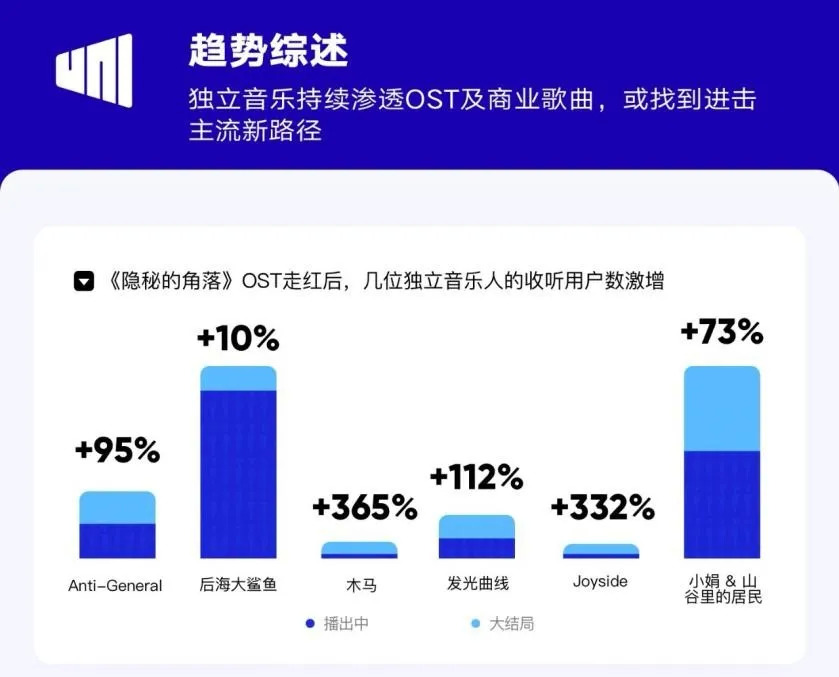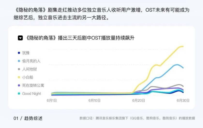 《2020·Q2华语数字音乐行业报告》中显示,自《隐秘的角落》播出三天后,剧中OST播放量迎来激增,直接带动了几位独立音乐人的收听人数增长:《犹豫》的创作者及演唱者木马Muma的听众增长率高达365%;插曲《死在旋转公寓》的原唱乐队发光曲线听众增长率达到112%;《人间地狱》的创作者电音音乐人Anti-General听众增长率则达到了95%。