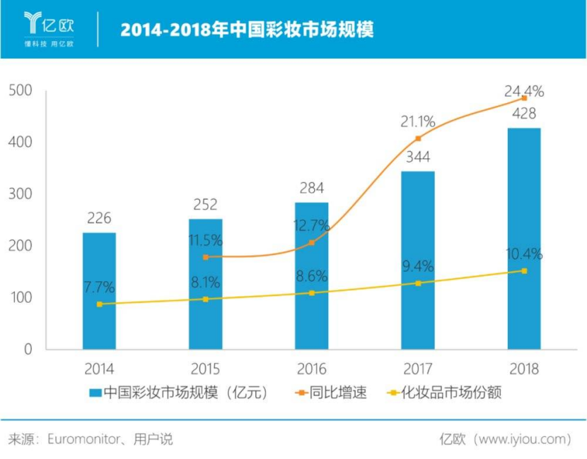 据Euromonitor统计,中国已经是全球第二大化妆品市场,约占大盘的20%,且增速远超美、日、韩,但人均消费水平却只有他们的1/6左右。